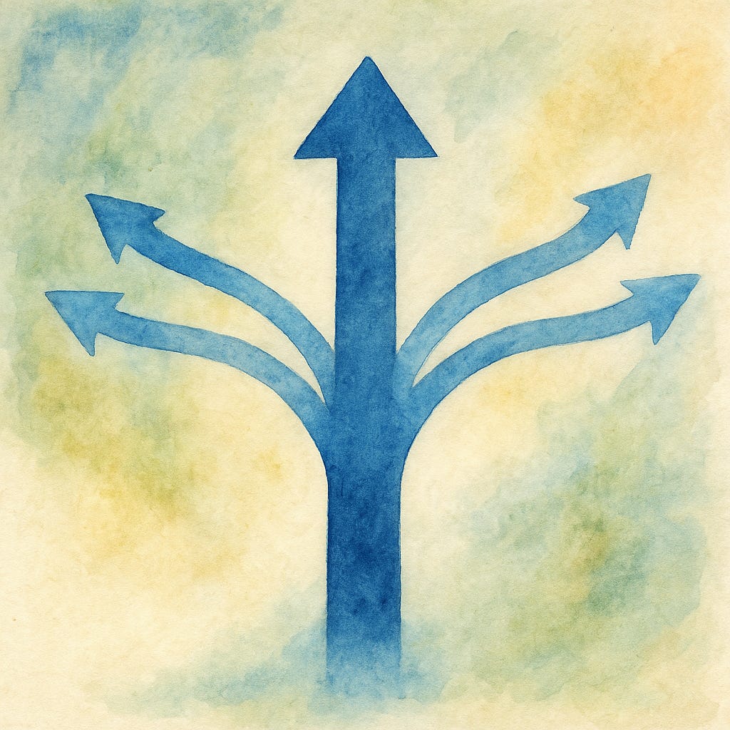 Create a square, watercolor-style digital illustration featuring a central, bold blue arrow pointing upward. The arrow should split cleanly into four curved branches or paths near the top, each also pointing upward and slightly outward, symbolizing diverse but progressive directions. Use soft, blended background tones—primarily greens, blues, and subtle yellows—to create a calm, intentional atmosphere. The style should feel modern and professional, not elementary or cartoonish. The overall composition should suggest clarity, inclusivity, and educational growth.