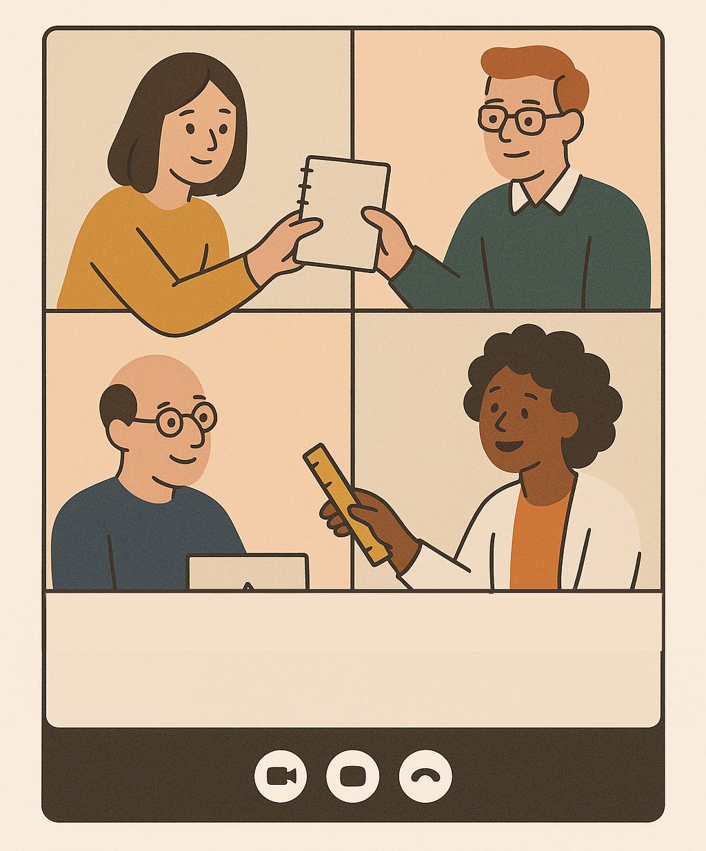 ChatGPT Prompt: A minimalist, flat-style digital illustration of a Zoom video call in portrait orientation. Four educators appear in a 2x2 grid, each in their own video panel. They are breaking the fourth wall by reaching out of their panels to share educational resources like notebooks, rulers, and worksheets with one another. The interface is simple with no text, and the background features warm, soft tones.