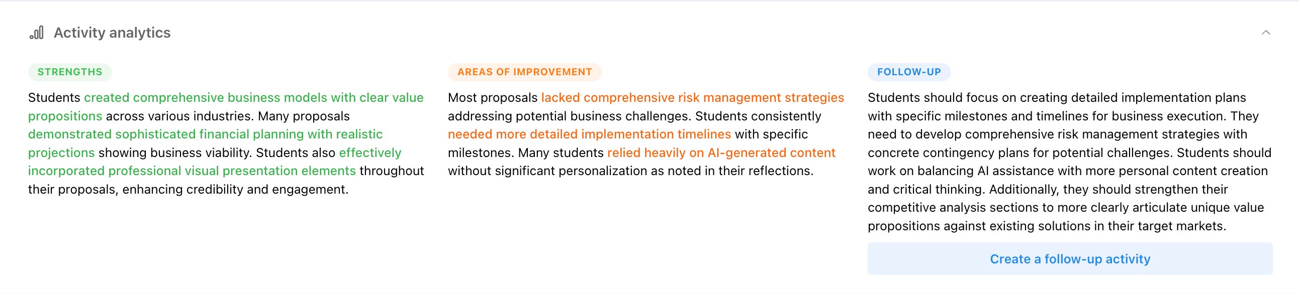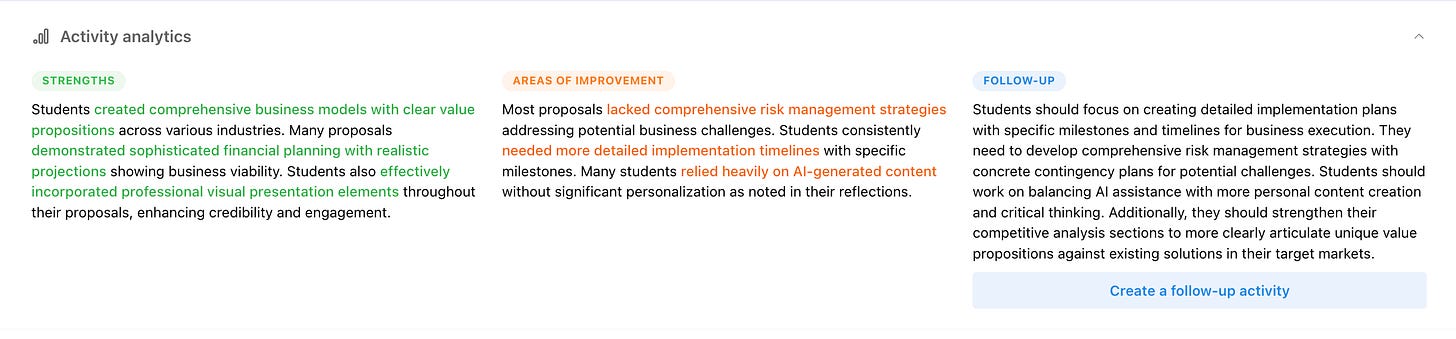 Flint AI activities create a list of strengths, areas of improvement, and follow-ups based on student submissions. The green and orange text are hyperlinks to examples in individual chats.