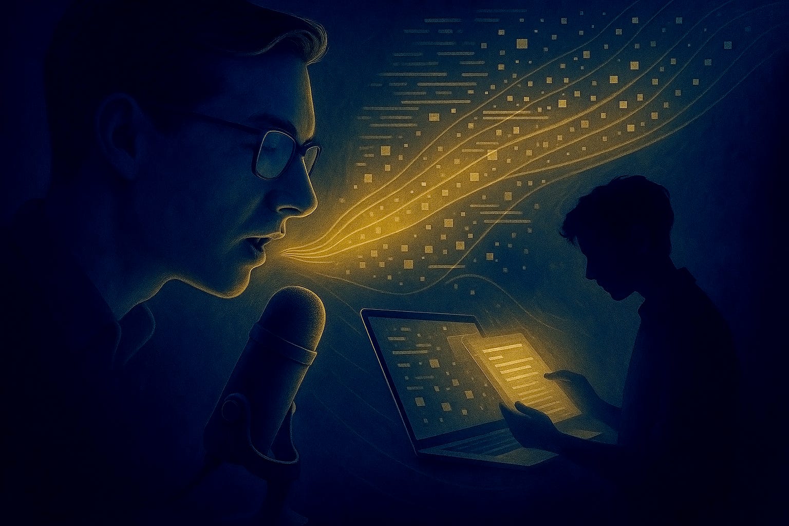 ChatGPT Prompt: A surreal, conceptual digital illustration of a light-skinned male teacher with short hair and blue glasses, speaking into a modern podcast-style microphone. Beside him, a sleek, ultra-modern laptop emits glowing data streams. Golden sound waves and geometric digital patterns flow from both the microphone and laptop, merging into a radiant stream that connects with a silhouetted student holding a glowing document or tablet. The background is a rich blend of muted blues and deep shadows, contrasted with warm golden highlights. The atmosphere is ethereal, with high contrast lighting and abstract symbols like data points, lines, and squares representing information transfer. The style is modern, dreamlike, and emotionally resonant, emphasizing the partnership between human insight and AI in education.