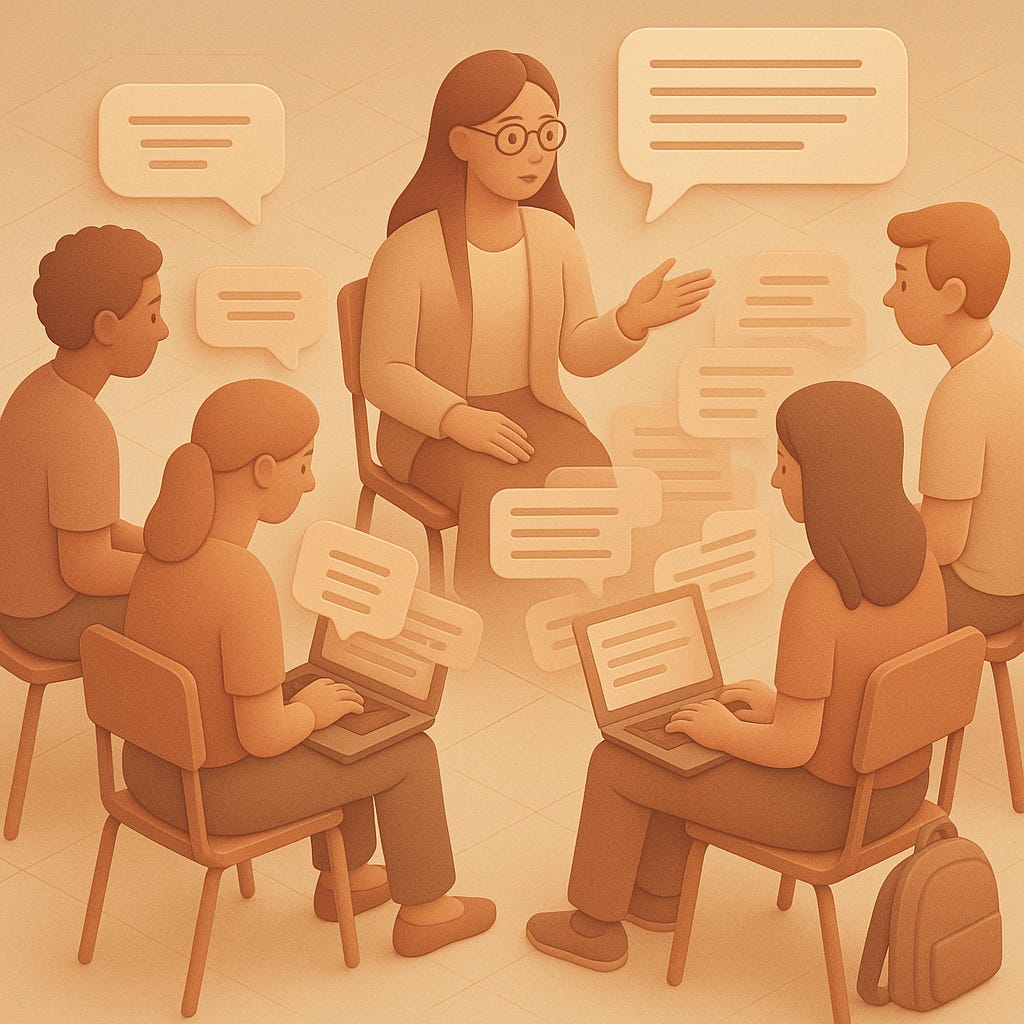 A warm-toned illustration in an isometric minimalism style with soft 3D relief. Show a diverse group of high school students sitting in a semi-circle, each with a laptop open on their lap. From every laptop, multiple overlapping snippets of text, chatbot icons, and note outlines flow upward in soft, semi-transparent layers, as if floating thought-clouds. At the center sits a female teacher with long hair and glasses, calm and engaged, gently gesturing as she guides the discussion. The perspective should be slightly elevated and isometric, with smooth shading and carved, dimensional forms rather than flat vectors. The color palette should use warm, muted tones like beige, terracotta, peach, and soft browns. The overall atmosphere should feel collaborative, professional, and focused on trust and learning.